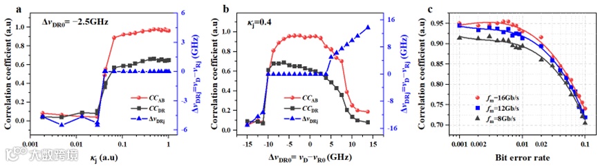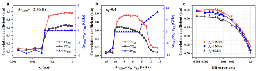 最后,我们利用相干光纤通信系统进行实验验证。实验装置如图3a所示,相干光纤传输链路是一个循环光纤环路,单圈长度为630.146 km,用于模拟长距离的直线传输。传输信号为32-GBaud 16-QAM信号。在光纤环路中传输13个周期时,光纤总传输长度约为8191 km,传输前后对应的误码率为0.014(图3b为信号星座图),满足上述误码率条件。将发射端和接收端信号的IT(t)和IR(t) 分别调制连续光的相位,然后注入两个响应激光器,产生了相似的混沌波形(图3c)。如图3d所示,两个激光器混沌波形的散点图呈现出明显线性关系,互相关系数为0.91。这一实验结果证明了利用光纤通信数字信号共驱激光器实现超长距离混沌同步的可行性。