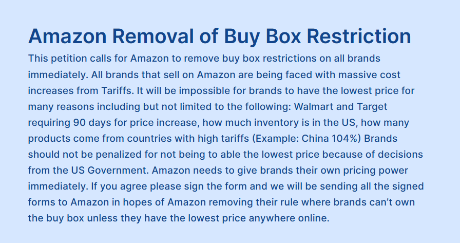 近日,一场由亚马逊卖家Brandon Fishman发起的联名请愿活动引发行业震动。超过千名卖家联合呼吁亚马逊修改“黄金购物车”(Buy Box)算法政策,核心诉求是允许品牌在关税压力下自主定价,而非被迫在“亏损销售”与“失去购物车”之间二选一。