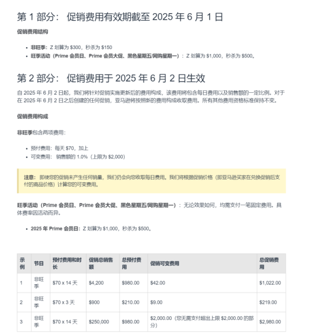 亚马逊在 2025 年全面改革促销活动收费模式,将原本固定的 300 美元 / 次 Z 划算费用,改为 "70 美元 / 天 + 销售额 1%" 的阶梯收费。这意味着,促销效果越好的商品,平台抽成越高。以某爆款为例,若促销期间销售额达 50 万美元,卖家需支付 70×14+50 万 ×1%=7980 美元,比去年高出 16 倍!