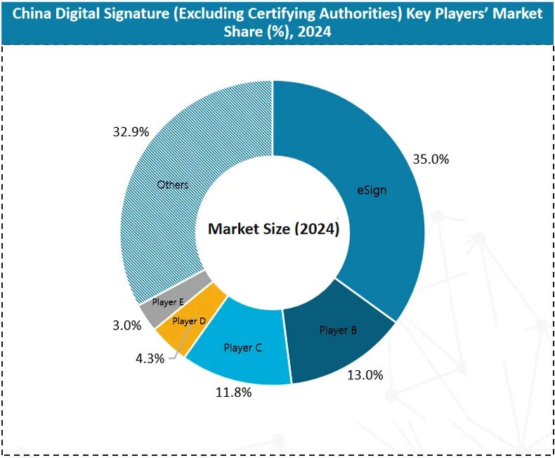 在竞争格局方面,2024年中国电子签名市场头部效应显著,TOP5厂商合计占据约67%的市场份额。