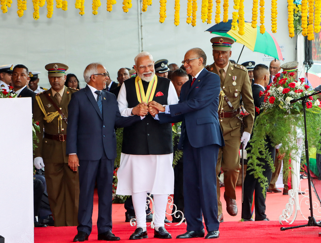 2025年3月12日,毛里求斯政府授予来访的印度总理莫迪“印度洋之星与钥匙最高统帅勋章”。图为授勋后莫迪与毛里求斯总统戈库尔(中左)、总理拉姆古兰握手。