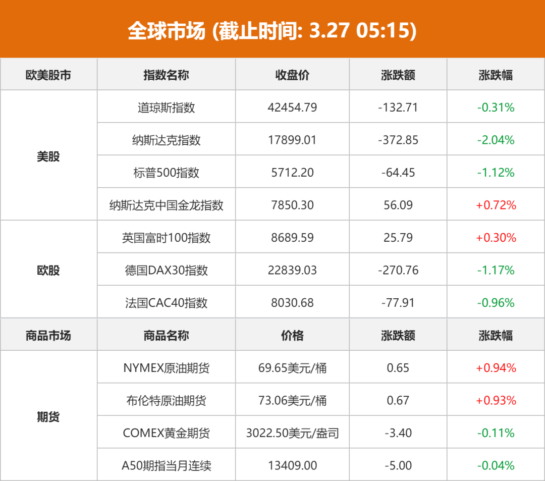 受关税影响,当地时间3月27日,美股三大指数集体收跌,纳指下跌372.85点,跌幅2.04%;标普500指数跌1.12%;道指跌0.31%。