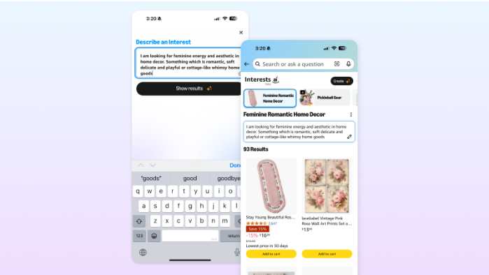 该功能允许用户在搜索栏中输入符合自身兴趣、偏好或预算的提示。例如,用户可在在Interests页面上点击“开始”按钮,输入要查找的内容的详细描述,例如“创新的厨房工具和食谱,让我的烹饪水平更高”。这些描述性提示可帮助展示最符合特定购物需求的产品。用户还能为不同的兴趣和需求创建多个提示。