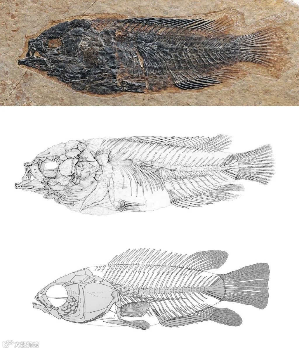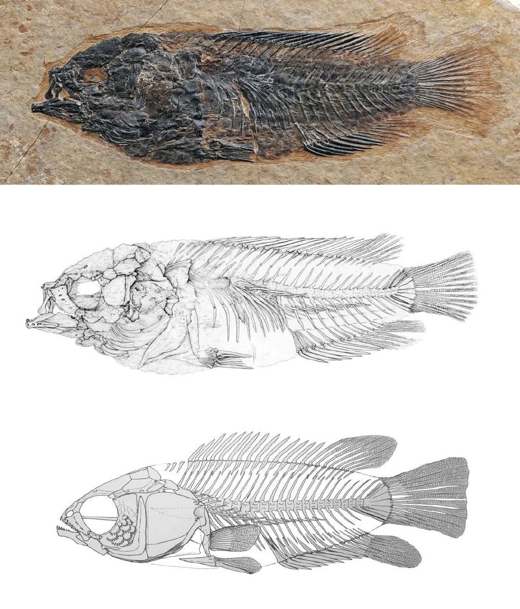 西藏始攀鲈的正模标本(上)、素描图(中)和骨骼复原(下)(吴飞翔/绘)
