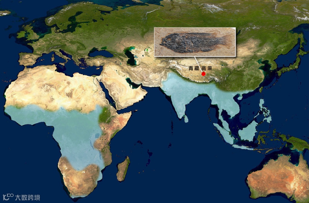 现代攀鲈的分布区(淡蓝色区域)与青藏高原攀鲈化石发现地位置