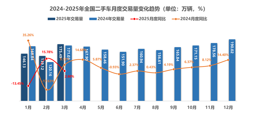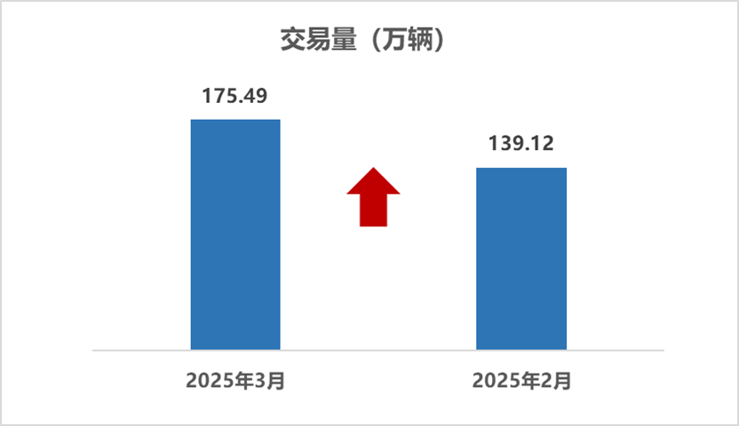 2025年3月,全国二手车市场交易量175.49万辆,环比增长26.14%,同比增长2.60%,交易金额为1169.95亿元。