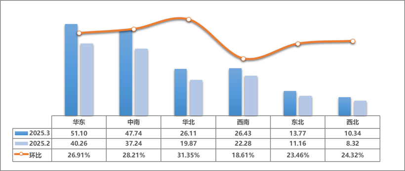 2025年3月,全国六大区二手车交易量均实现了显著增长。其中,华北地区表现突出,环比涨幅超过30%。华东、中南、东北以及西北地区环比涨幅均超过了20%,相比之下,西南地区的涨幅相对略小。