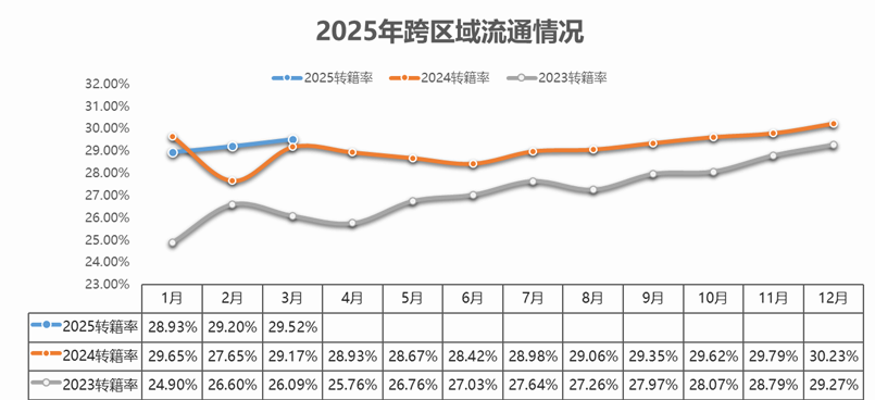 3月,二手车转籍率为29.52%,环比上月增长0.31%,同比去年同期增长0.34%。二手车转籍总量为51.79万辆,环比增长27.49%,较去年同期增长3.81%。