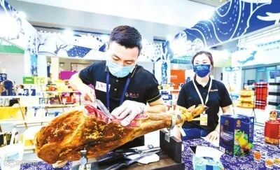 在黔大门的展位上,一位正在切火腿的“小哥哥”吸引了不少观众。只见他切下来的火腿肥瘦分明、晶莹剔透,十分诱人。据该展位工作人员介绍,该火腿肉质紧实,口感细腻,进嘴之后立刻就可以品尝到浓浓的肉香,而且越嚼越香,现吃现切、风味极佳。“如果在吃的时候配上一杯红酒,火腿的风味会发挥到最大。”
