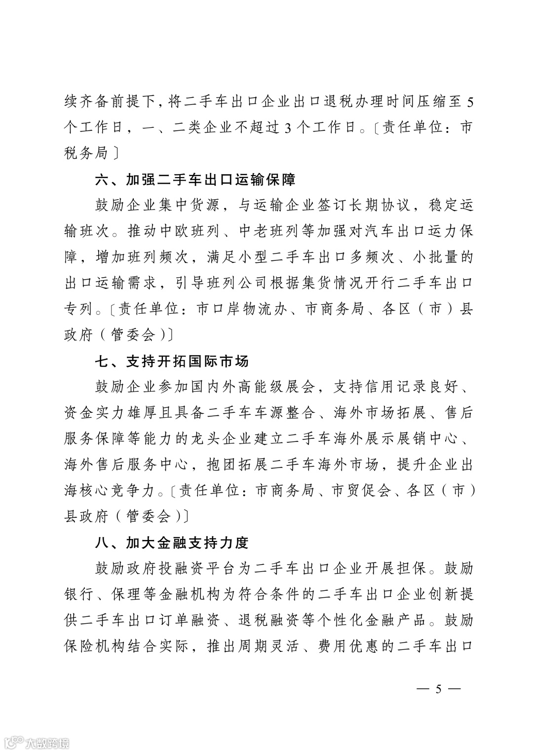“支持开拓国际市场”,《措施》明确,鼓励企业参加国内外高能级展会,支持信用记录良好、资金实力雄厚且具备二手车车源整合、海外市场拓展、售后服务保障等能力的龙头企业建立二手车海外展示展销中心、海外售后服务中心等。《措施》还提出,加大金融支持力度,鼓励银行、保理等金融机构为符合条件的二手车出口企业创新提供二手车出口订单融资、退税融资等个性化金融产品等。