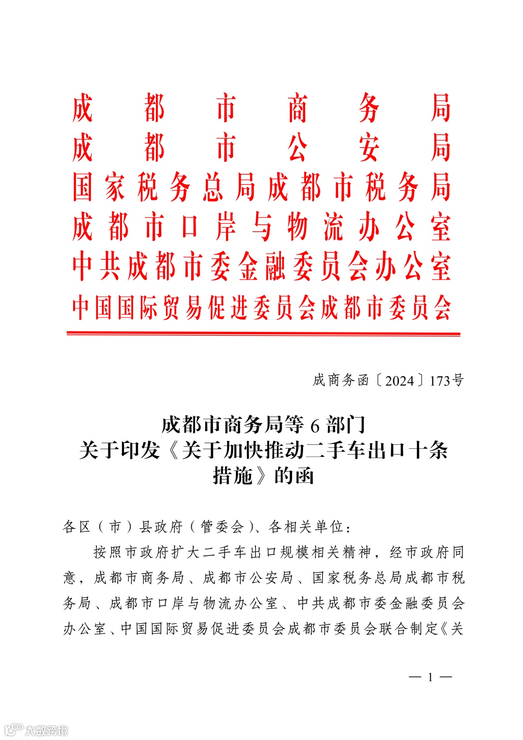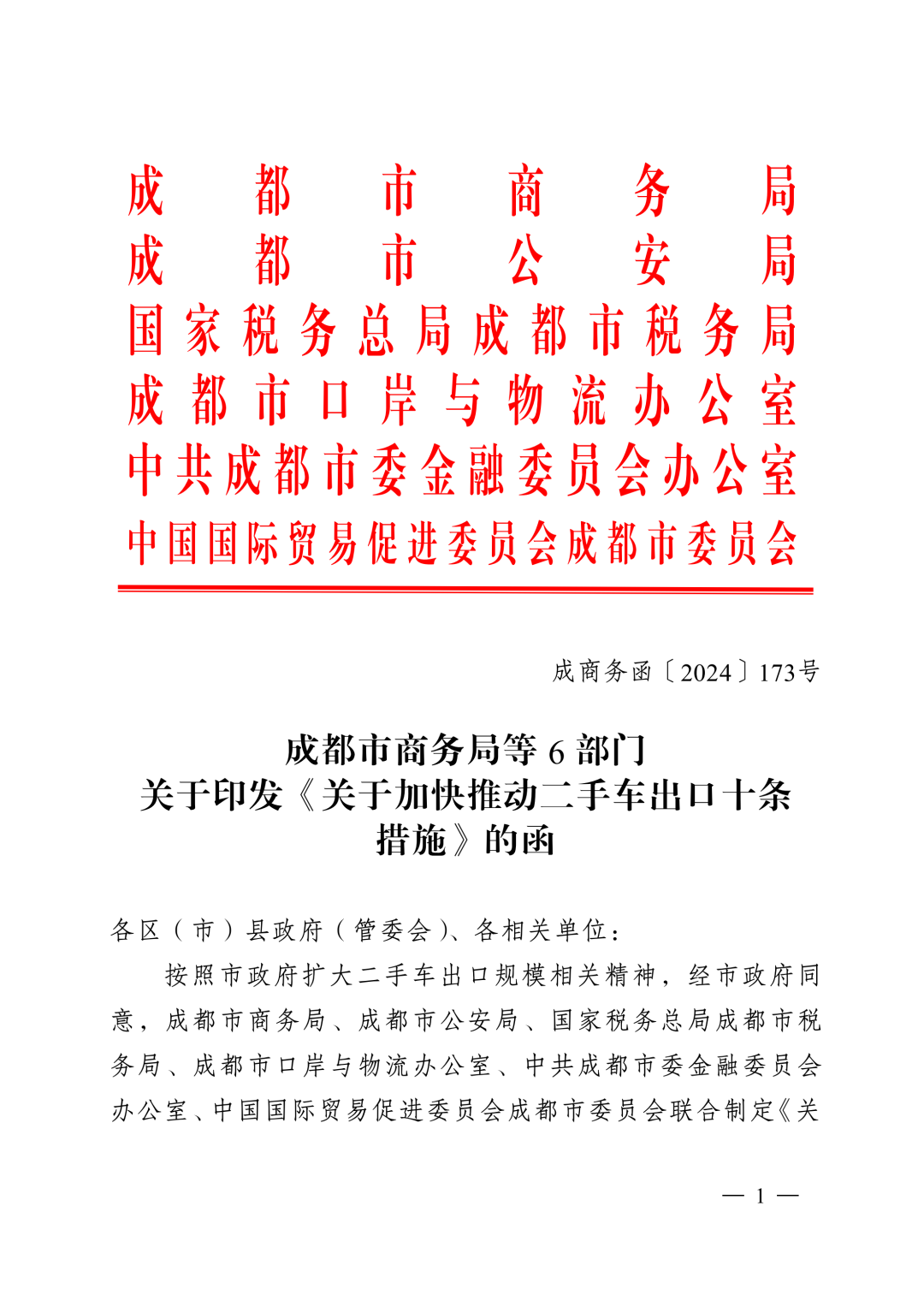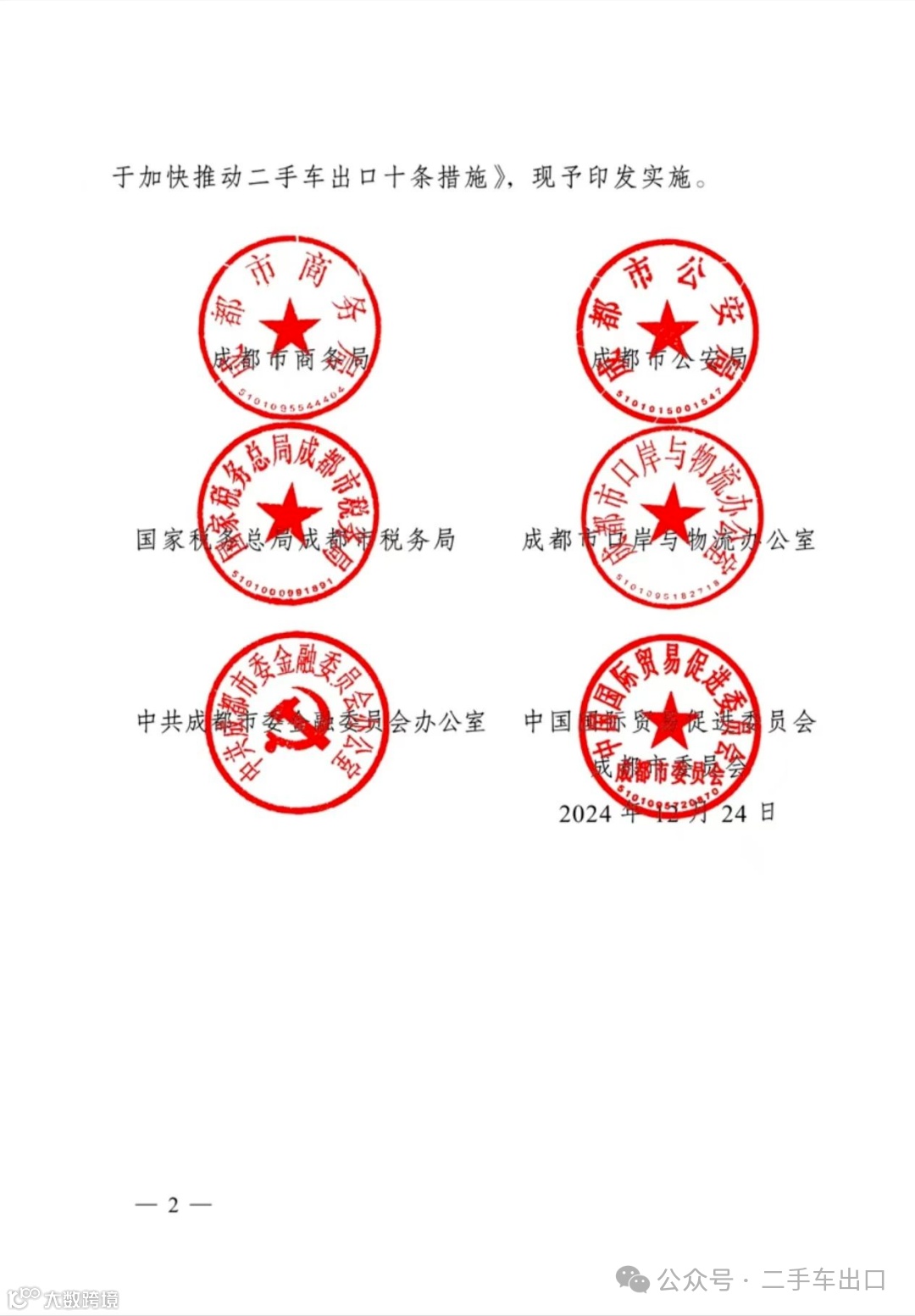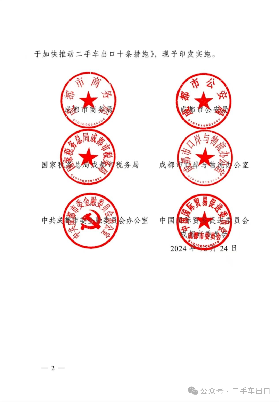 12月24日记者获悉,成都市商务局、成都市公安局、成都市税务局、成都市口岸物流办、成都市委金融办、成都市贸促会等部门联合制定的《关于加快推动二手车出口十条措施》正式印发,明确力争2025年有出口实绩的二手车出口企业达100家以上,并提出支持在蓉出口二手车“入区即退税”、将许可证签发时间压缩到1个工作日内等支持措施。