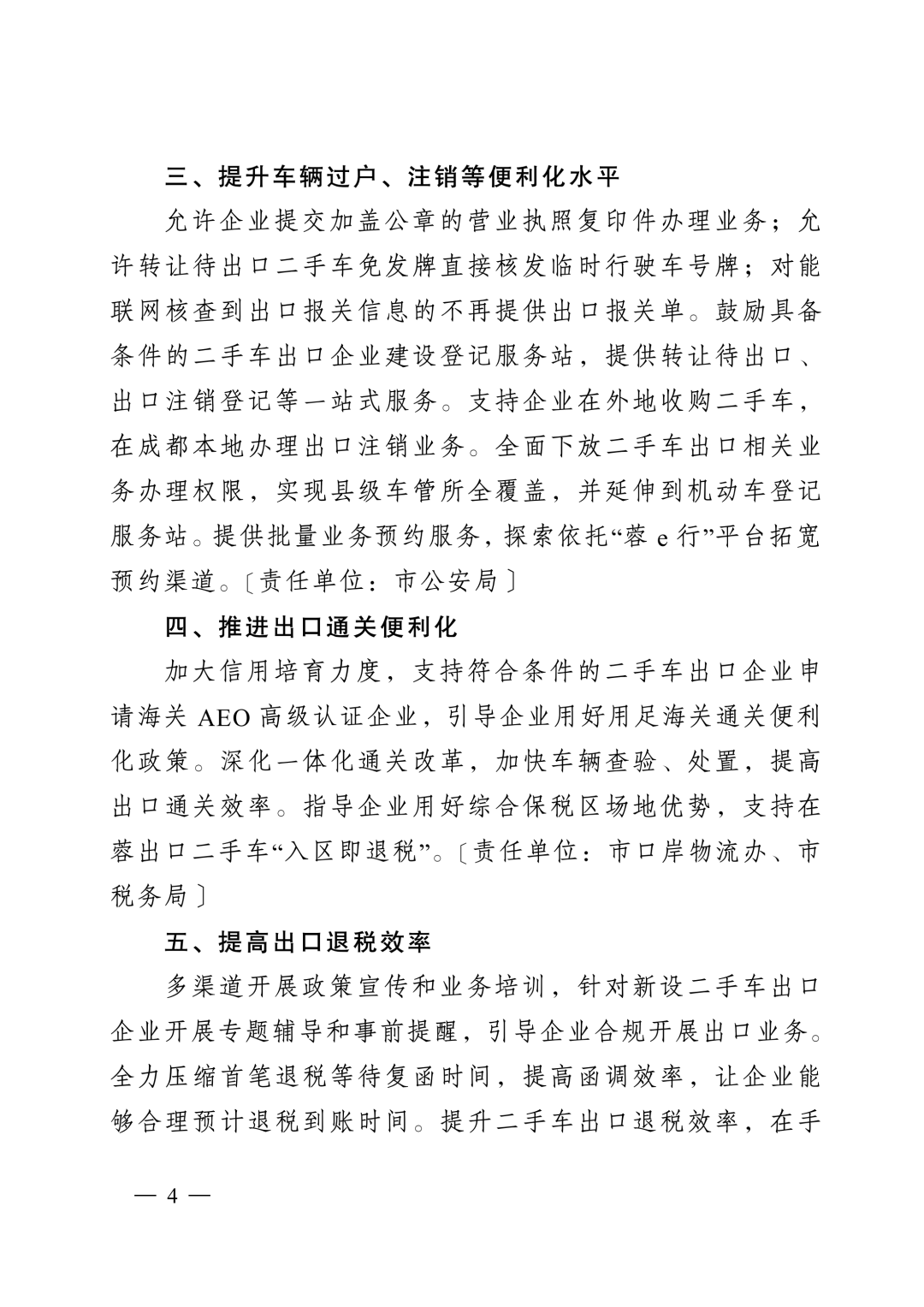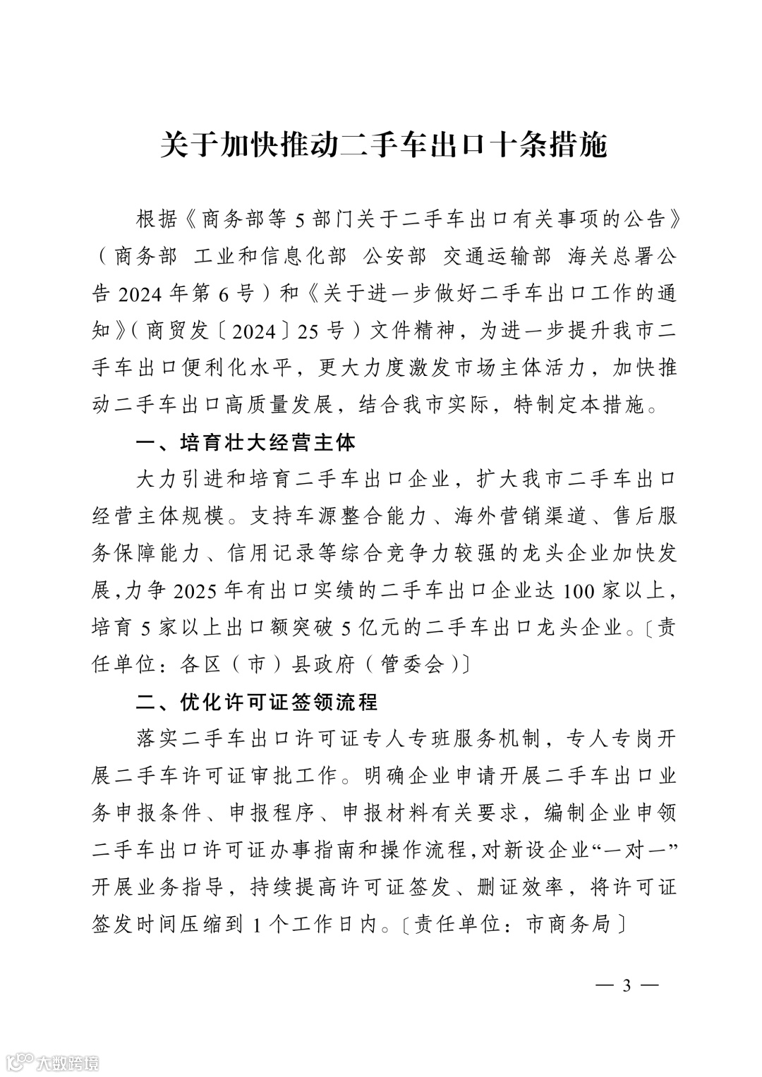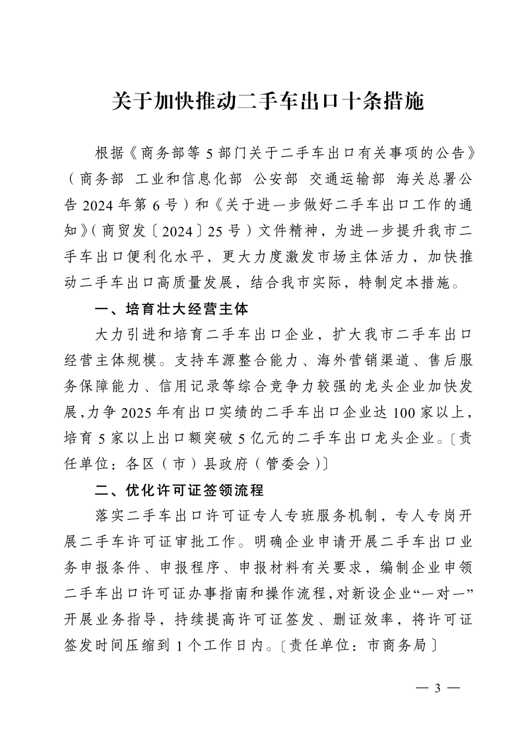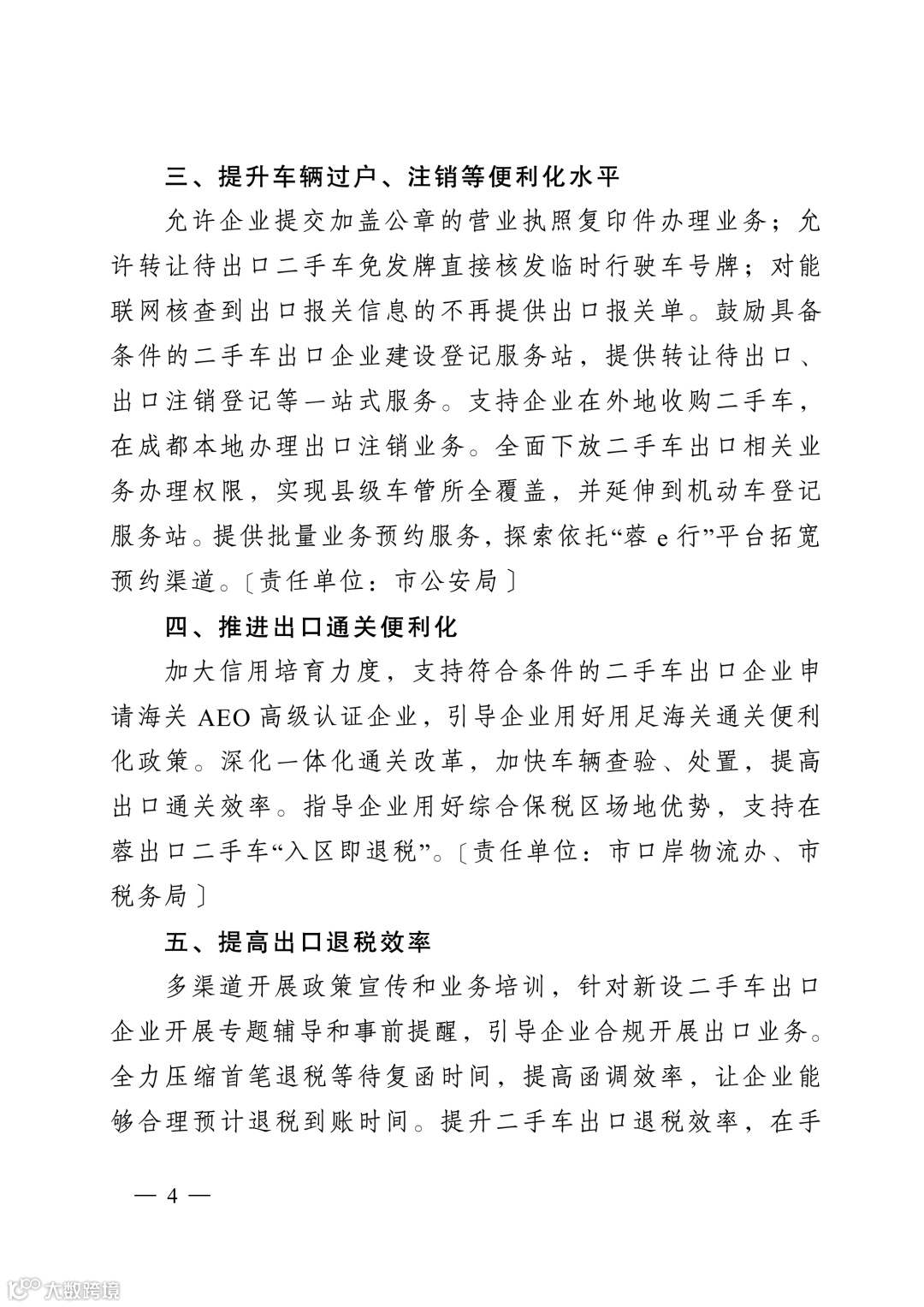 12月24日记者获悉,成都市商务局、成都市公安局、成都市税务局、成都市口岸物流办、成都市委金融办、成都市贸促会等部门联合制定的《关于加快推动二手车出口十条措施》正式印发,明确力争2025年有出口实绩的二手车出口企业达100家以上,并提出支持在蓉出口二手车“入区即退税”、将许可证签发时间压缩到1个工作日内等支持措施。