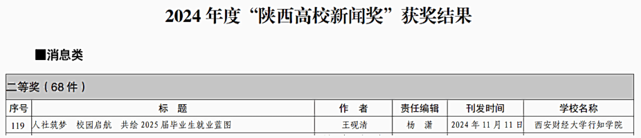 近日,2024年度“陕西高校新闻奖”评选结果揭晓,我院大数据2202班王砚清撰写的《人社筑梦 校园启航 共绘 2025 届毕业生就业蓝图》获消息类二等奖。