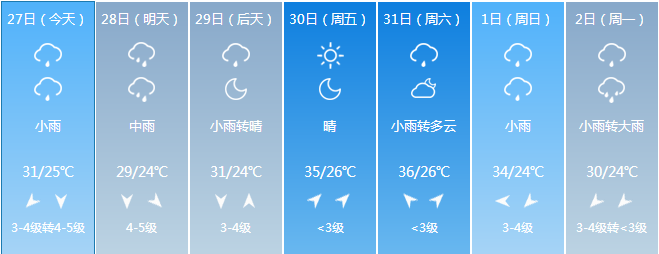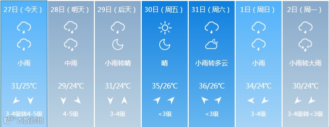 7月27日:阴天转小到中阵雨、雷阵雨,东北风:3-4级,最低气温:24-25度,最高气温:30-31度;