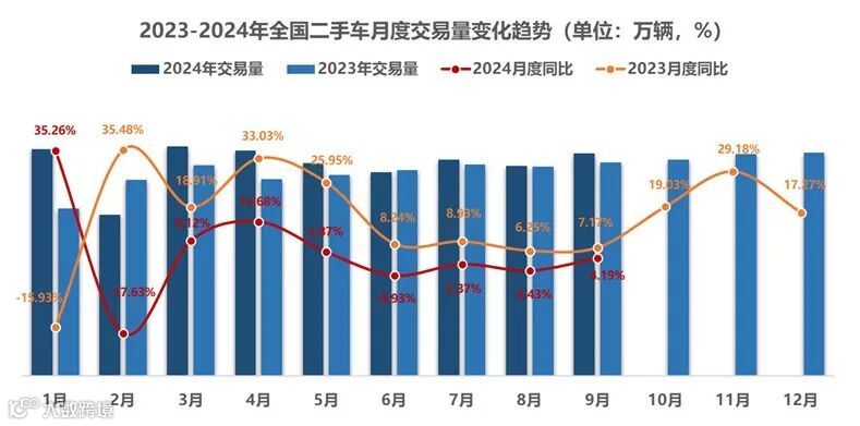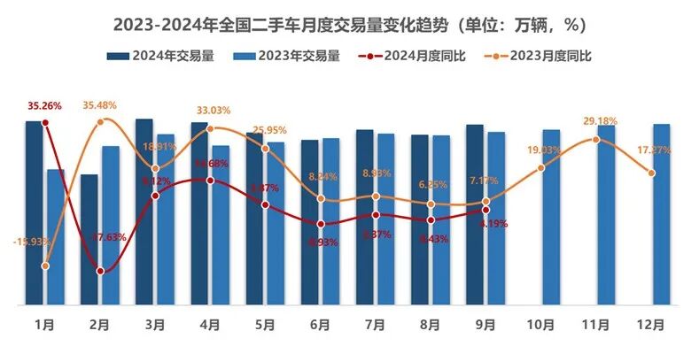 2024年9月,全国二手车市场交易量165.84万辆,环比增长5.89%,同比增长4.19%,交易金额为1063.91亿元。