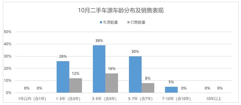 3-5年的“次新车龄”数据与上月保持一致,5-7年“性价比”车型数据则较上月减少了1%,及7-10年“老旧车型” 则增加1%。