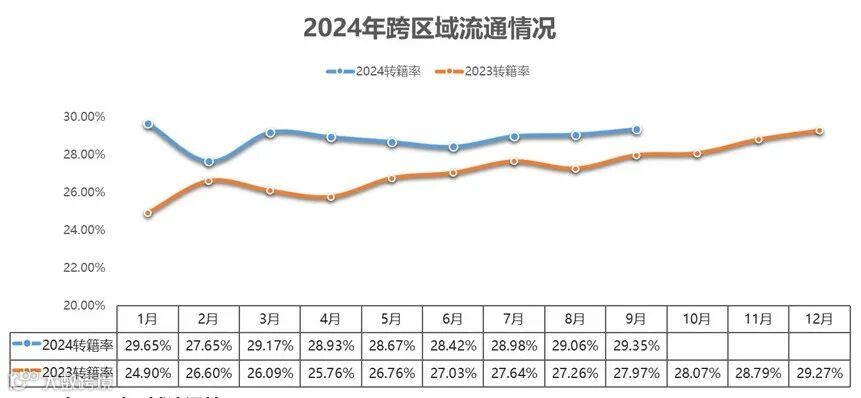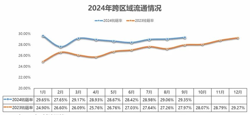 2024年9月,全国转籍比例排名前五的省份是北京、山东、上海、江苏、浙江。