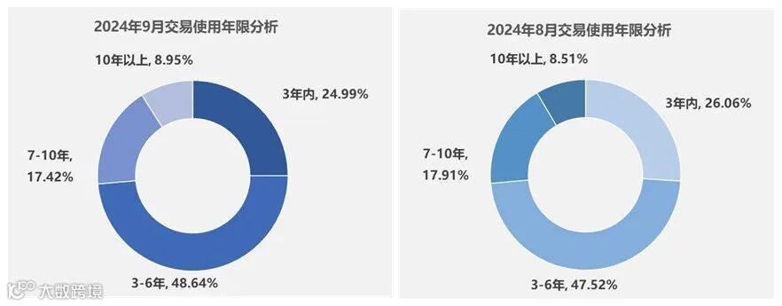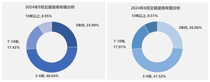 9月,二手车使用年限在3-6年的交易占比最多,占48.64%,环比增长1.12%,较去年同期增长2.65%; -