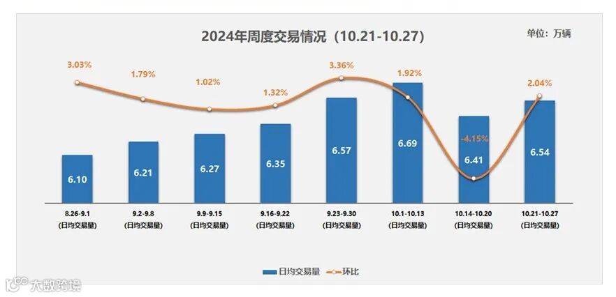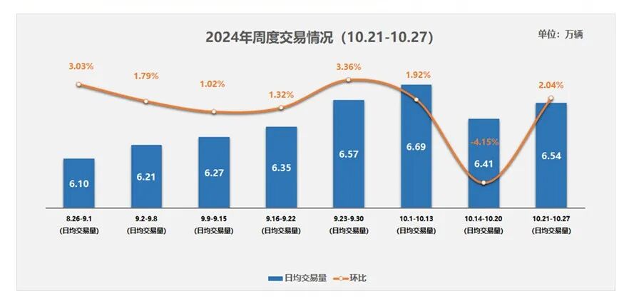 2024年10月21日-10月27日,二手车市场日均交易量为6.54万辆,环比上周增长2.04%,较9月同期下降0.4%。