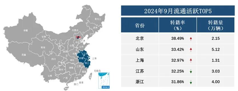 山东转籍率为33.42%,环比增长2%,转籍量5.12万辆;