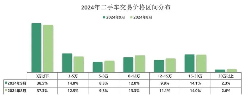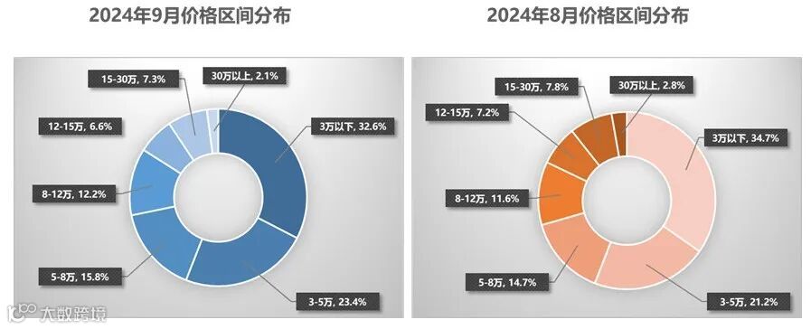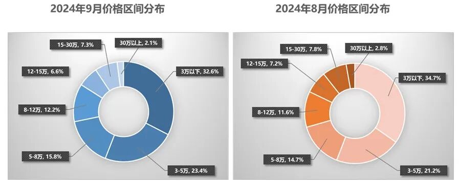 2024年9月,3万以下、3-5万、15-30万的新能源二手车占比有所增长,其余各区间较上月均出现不同程度的下降。 -