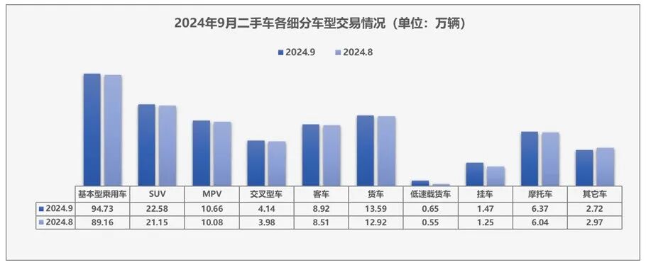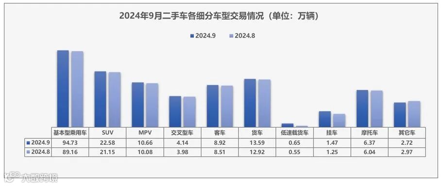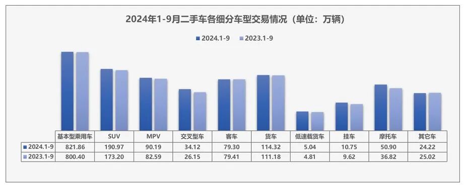 2024年1-9月,二手车累计交易量1421.68万辆,同比增长5.37%。基本型乘用车累计交易821.86万辆,同比增长2.68%;SUV共交易190.97万辆,同比增长10.26%;MPV共交易90.19万辆,同比增长9.20%;交叉型乘用车共交易34.12万辆,同比增长30.52%。 -