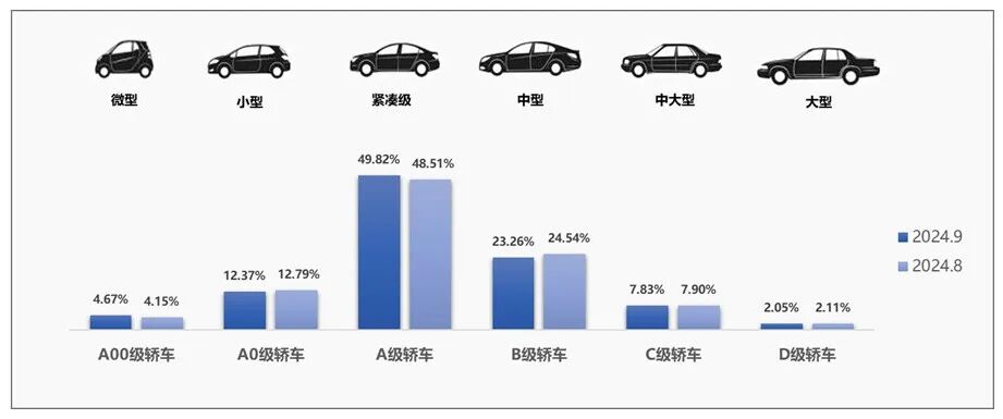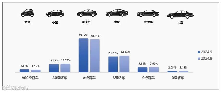 整体上看,9月份,A级、A00级轿车的份额有所增加,B级车型较上月出现较明显的下降。