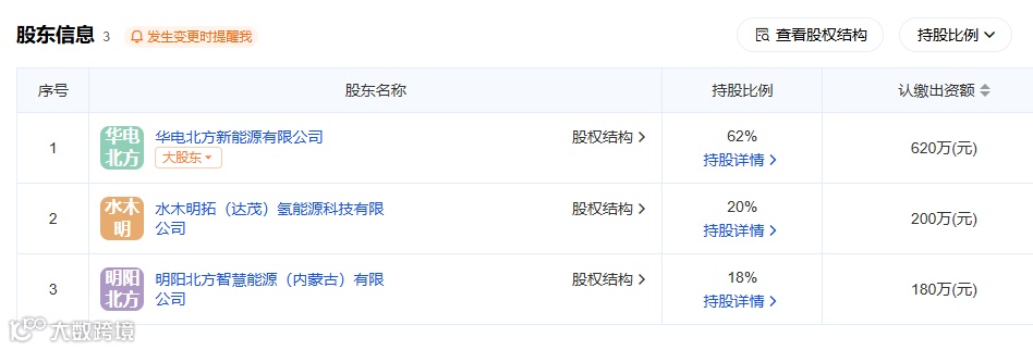 据悉,内蒙古华电拓阳氢能科技有限公司成立于2024年12月04日,由华电北方新能源有限公司、水木明拓(达茂)氢能源科技有限公司和明阳北方智慧能源(内蒙古)有限公司共同持股。其中华电北方新能源有限公司为华电新能源集团股份有限公司的全资子公司,明阳北方智慧能源(内蒙古)有限公司为明阳智慧能源集团股份公司的全资子公司。