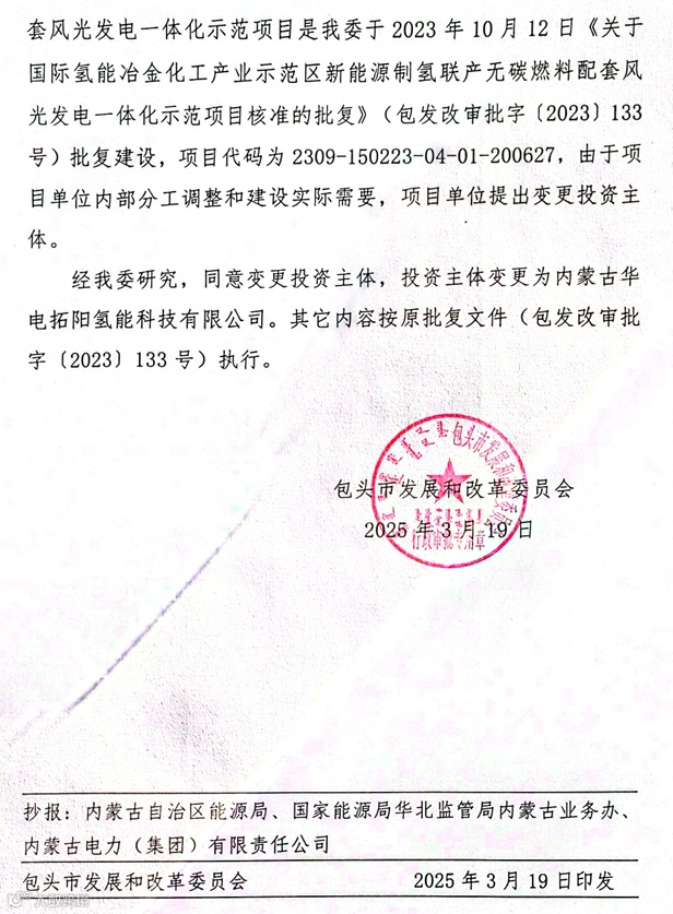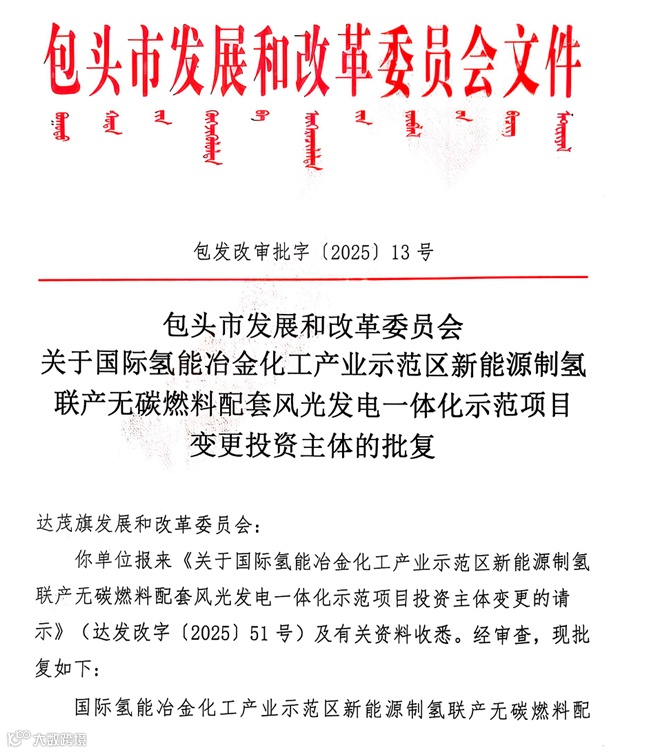 此前发布的信息显示,国际氢能冶金化工产业示范区新能源制氢联产无碳燃料配套风光发电一体化示范项目计划总投资35.89亿元,项目建设地点为达茂旗巴音花镇白音教包查、白音查干嘎查、明安镇希拉朝鲁嘎查,白云矿区白云鄂博巴润工业园区。