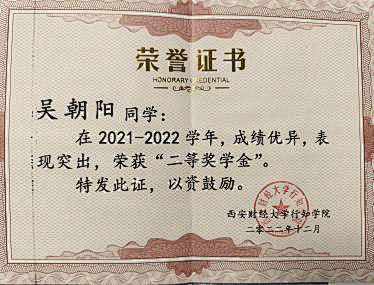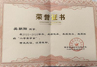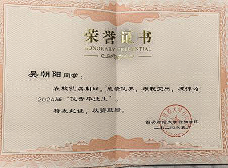 吴朝阳,来自经济与统计学院财政2002班,严于律己,勤奋好学,专业排名靠前,多次获得奖学金和荣誉证书,通过了英语四级考试,获得了初级会计资格证书。坚决拥护中国共产党的领导,认真学习党的理论,现在成为一名正式的中国共产党员。积极参加校内外活动,不断丰富自己的生活阅历。