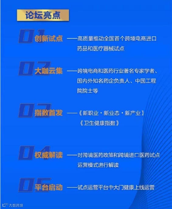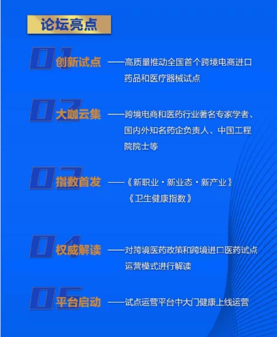 今年的跨境医药论坛是首次举办,以“创新跨境药品,服务公众健康 ”为主题,将发布权威医药卫生三大指数,启动中大门健康平台,对跨境医药政策和跨境进口医药试点运营模式进行解读,并邀请医药行业专家学者、国内外知名药企、权威医院代表、行业协会、跨境电商平台、医药物流企业等展开深入研讨,推动上下游产业链对接。