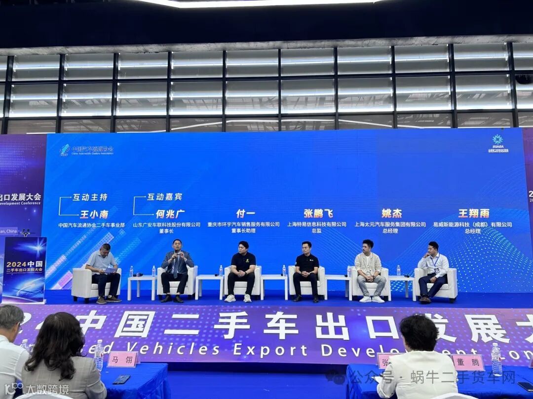 中国汽车流通协会二手车事业部王小南主持了互动沙龙《二手车出口如何提高海外市场竞争力及发展前景展望》。互动嘉宾山东广安车联科技股份有限公司董事长何兆广、重庆市环宇汽车销售服务有限公司董事长助理付一、上海特易信息科技有限公司总监张鹏飞、上海太元汽车服务集团有限公司总经理姚杰、易威新能源科技(成都)有限公司总经理王翔雨充分发表了各自的观点和意见,针对机遇与挑战展开了激烈的讨论。他们一致认为,中国二手车出口企业应加强品牌建设,提高产品质量和服务水平,同时积极开拓国际市场,以应对日益激烈的国际竞争。