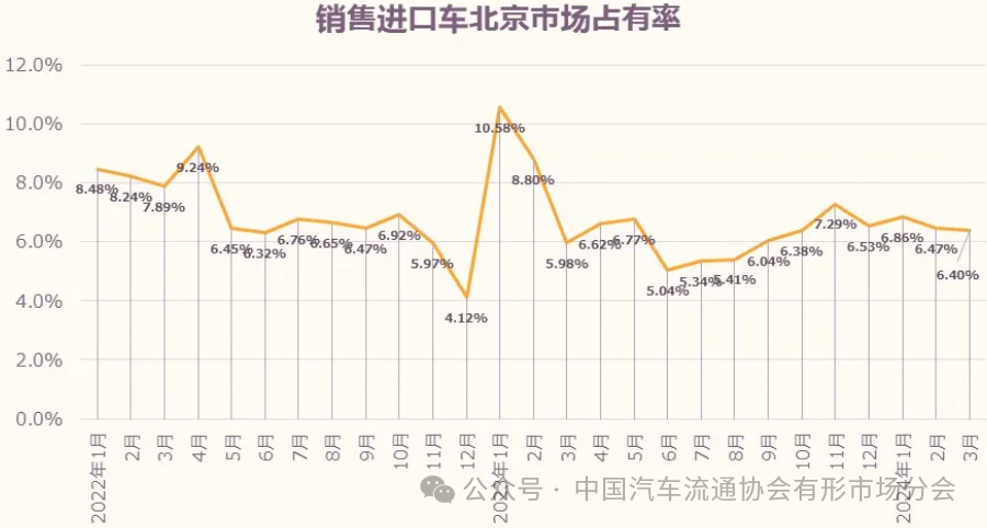 3月北京进口车销量占北京新车交易总量6.4%,占有率环比下降0.07个百分点,同比增长0.42个百分点。