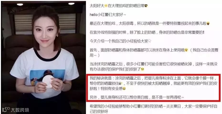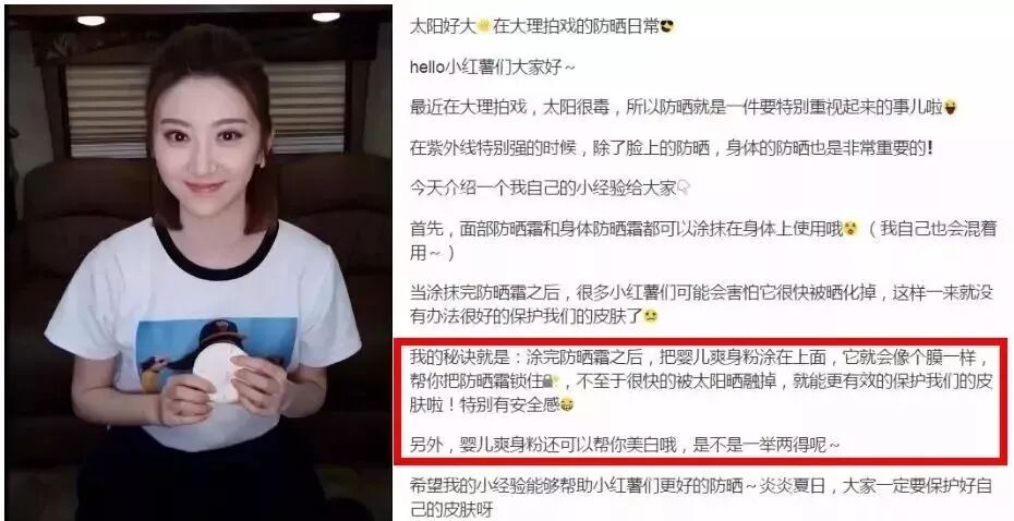 景甜说因为最近在云南大理拍戏,太阳特别毒,防晒霜很容易被晒化掉。所以她会在涂完防晒霜后直接拍上婴儿爽身粉,是不是很6?