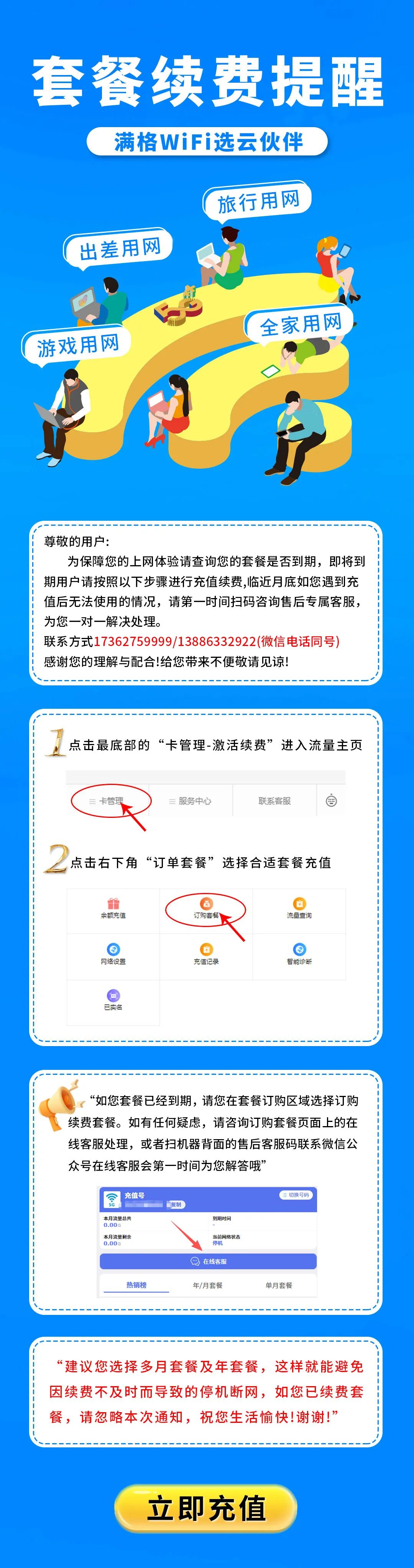 售后服务 我司客服在线时间为早8:30--晚22:00(周一至周日),若有上网疑问,可随时在公众号菜单栏点击“联系客服”在线实时处理或扫机器背面咨询售后客服。