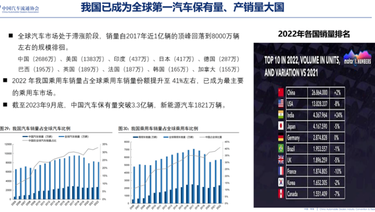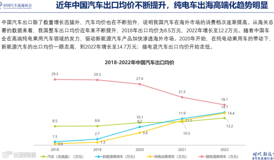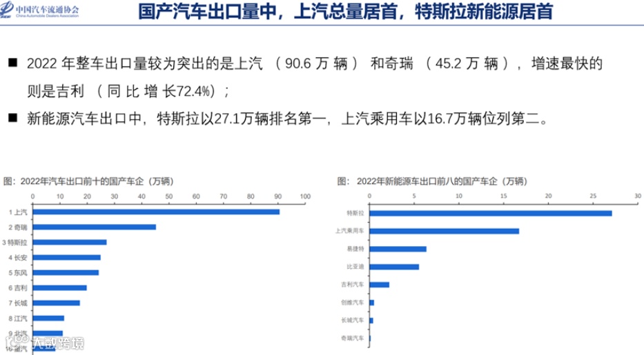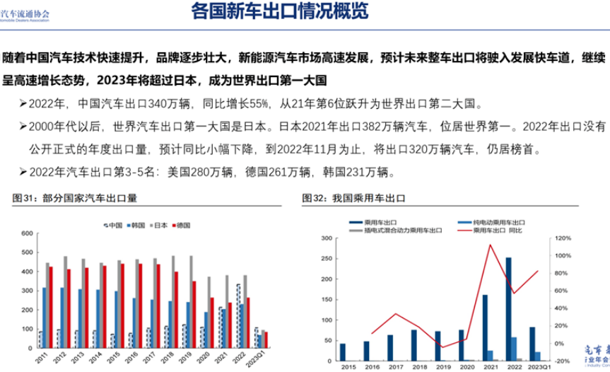新车出口方面,从2021年开始每年都是以新增100万辆的规模在快速增长。2022年已经跃升为全球第二的出口大国,今年按照上半年的数据已经超越了日本,成为了全球第一出口大国。