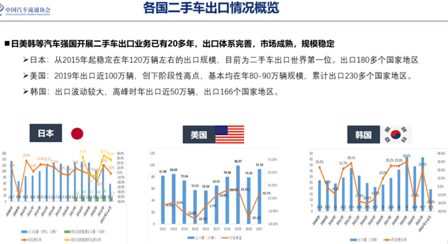 二手车出口方面,日、美、韩等国,日本每年都稳定在120万到150万出口的规模,美国也在80到90万辆,韩国高峰时也年出口近50万辆;而中国作为汽车保有量第一、产销量第一的大国,有着更好更多的二手车基盘,所以预测未来3到5年,中国将能够每年出口二手车超过50万辆。