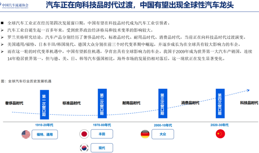 全球市场方面,现在整个汽车已经从消费品时代向科技品时代转型升级,现在全球竞争,拼得不是以前的常规生产,更多的是更炫的科技化、信息化、智能化、电动化等的竞争点。以前像福特、丰田、现代、大众等生产企业,都抓住了产业变革的机会,不断崛起。中国汽车也能够抓住向科技品时代转变的大好时机,迎来占领全球新市场的机遇。