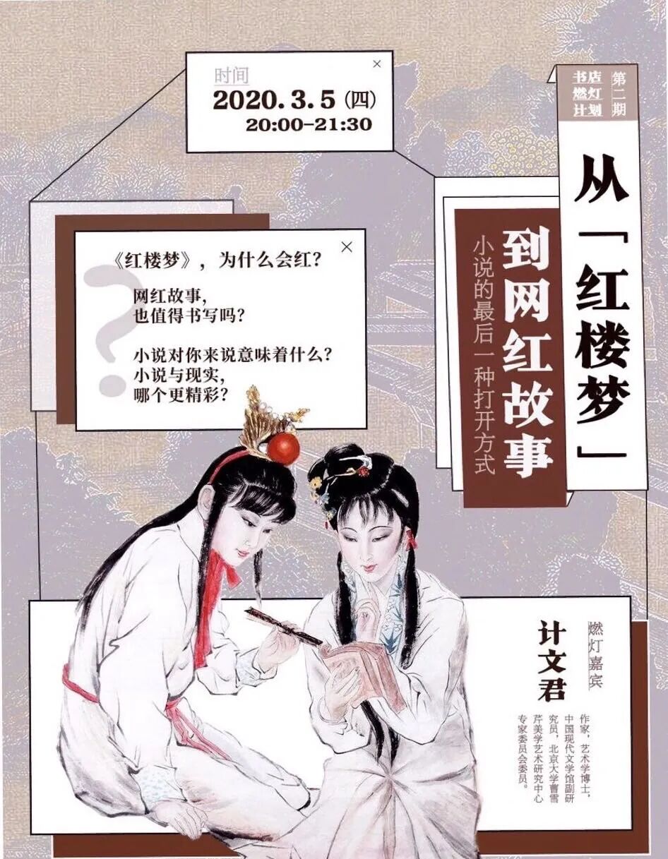 书店燃灯计划第二期定于3月5日晚八点,邀请计文君老师分享“从《红楼梦》到当代网红”。