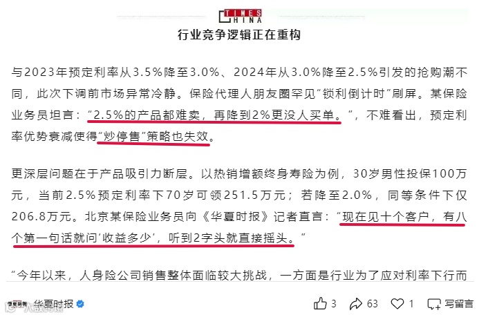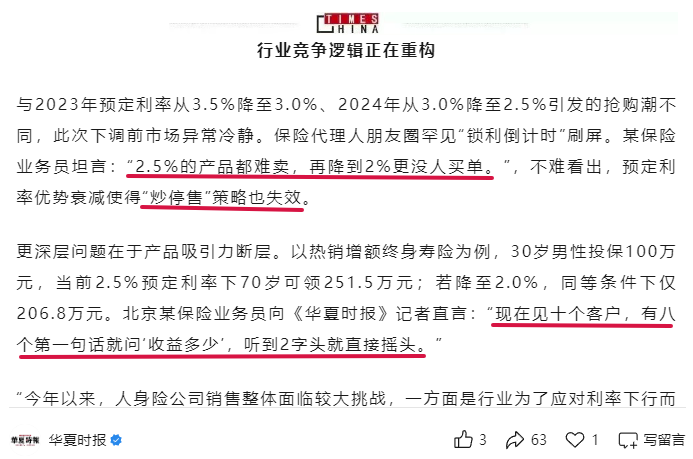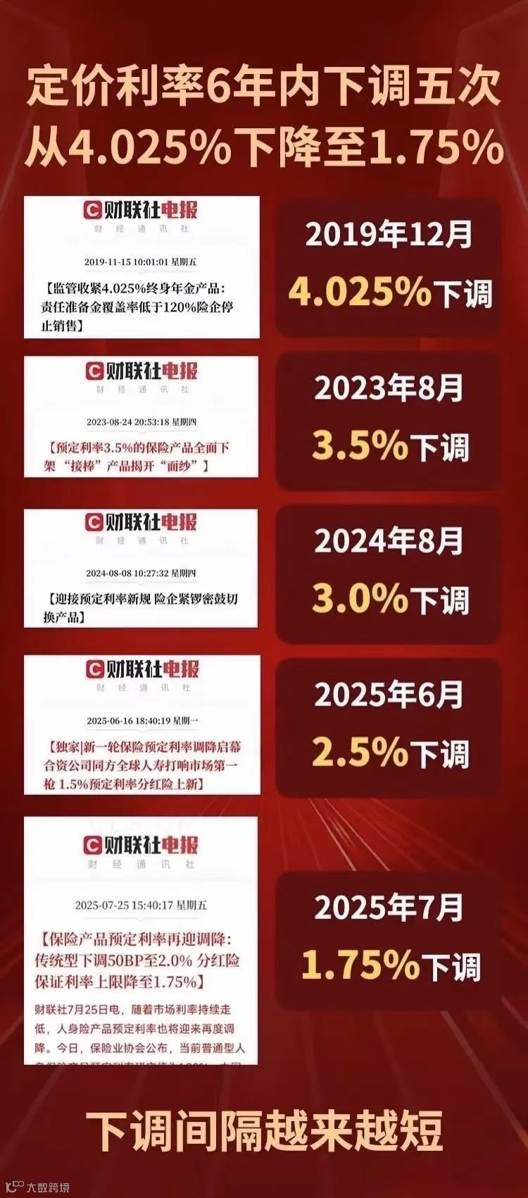 回顾内地保险定价利率的调整,一路大跳水,从最初很高的8%,到前年的3.5% 、去年3.0%、今年2.5%、马上破2%......下调间隔越来越短。
