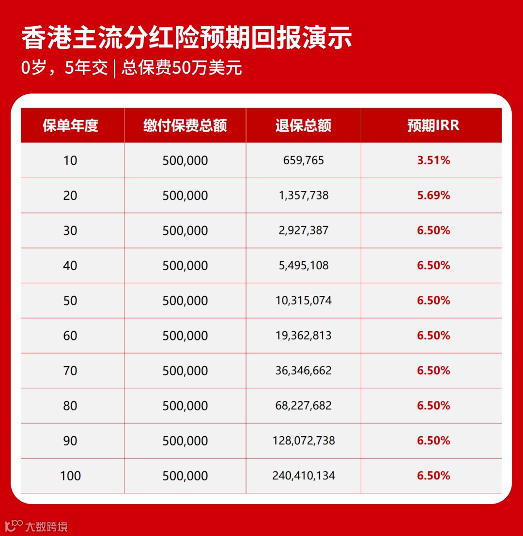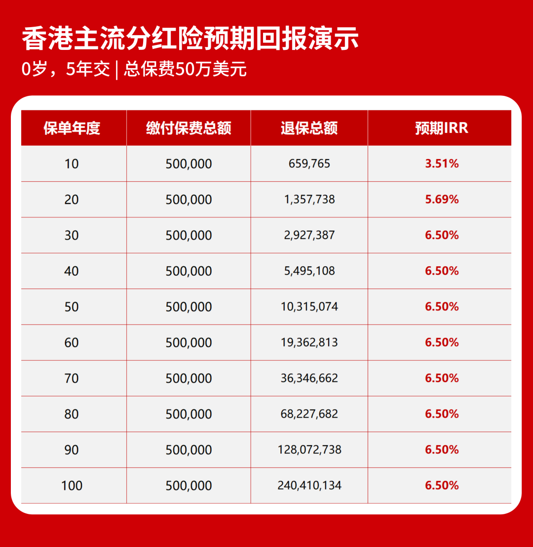 香港主流储蓄分红险,长期持有的情况下,复利IRR能达到6.5%,头部的保司如友B、保C、宏L、安S等,都有相应的王牌计划。