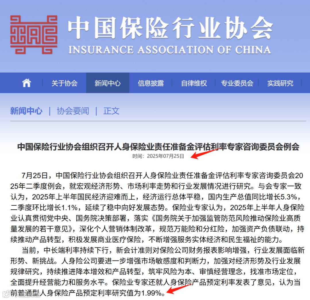7月25日,中保协最新公布的预定利率研究值为1.99%,已连续第二次低于2.25%水平。