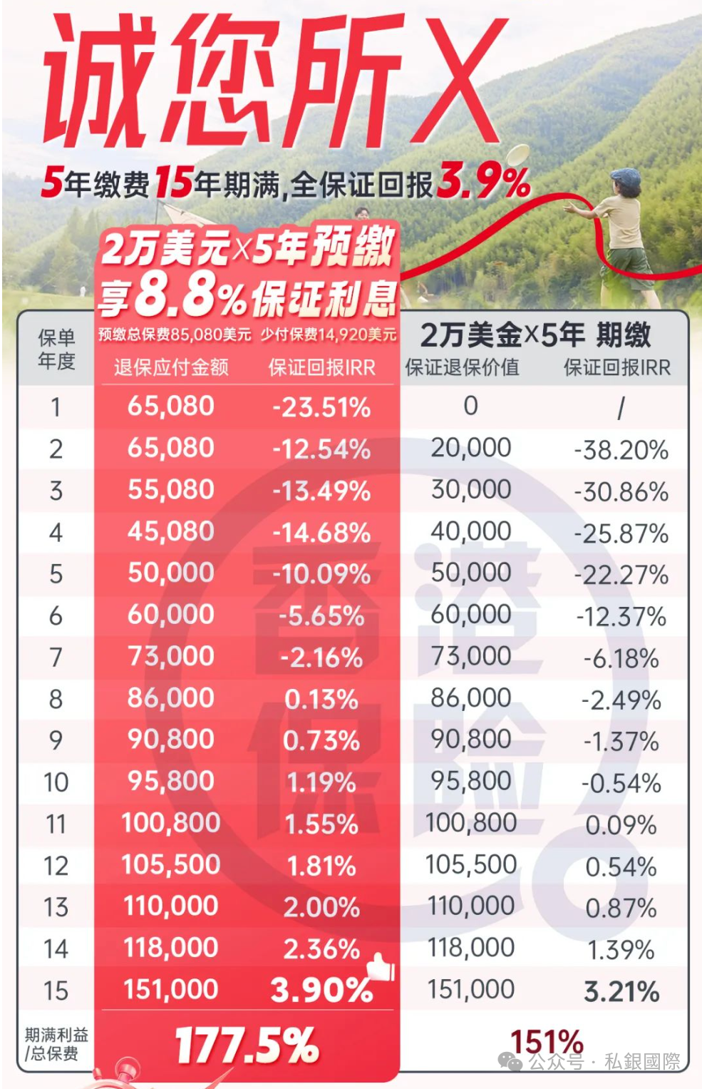香港储蓄险的底层资产绝大部分是债券,所以港险收益率与债券收益率息息相关。参考当前美国10年期国债收益率3.87%,中国10年期国债收益率2.18%,保诚「诚您所想」5年供款,预缴锁定8.8%利息,15年期满全保证IRR回报3.9%,可以获得本金的177.5%,在不确定性的市场中,中期锁定美元高息利率,给投资者提供了确定性的投资选择。