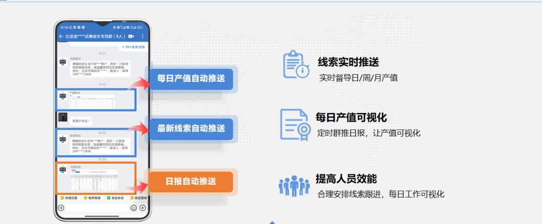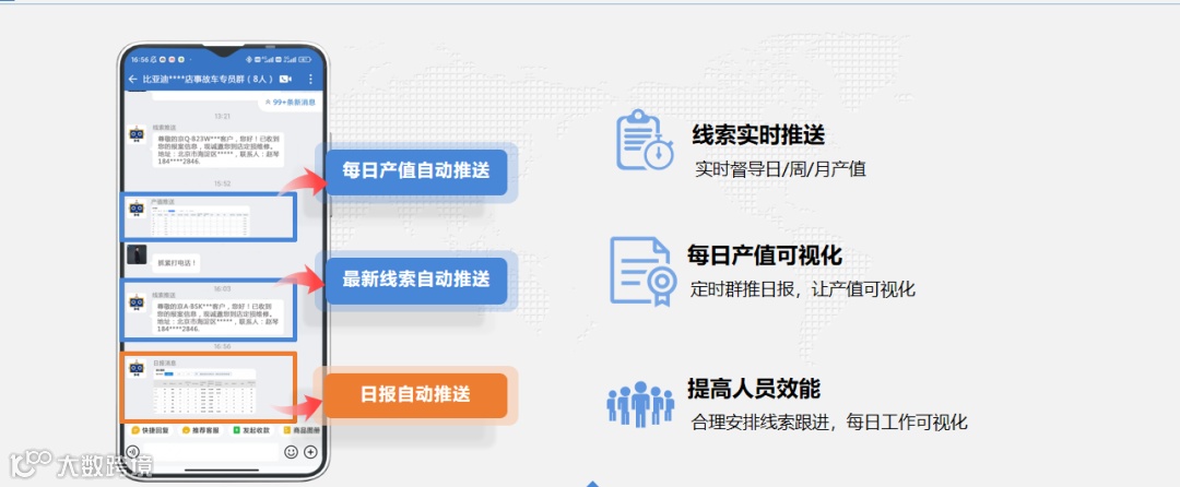 在整个逻辑过程当中,有一个群的小助手会把我们最新的线索自动推送到管理内部群当中,每日事故车所产生的产值会自动推送到群内,日报也会自动推送到管理群当中,这样大家就可以通过机器人助手来协助事故车线索的管理。