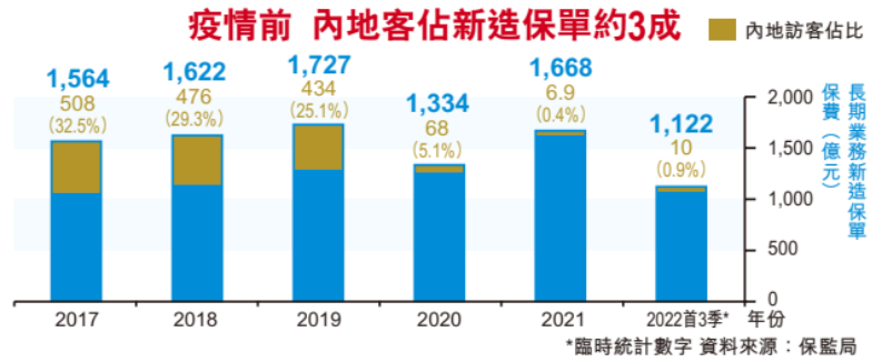疫情前,内地访客每年的新单保费规模约400-500亿港元,(2019年