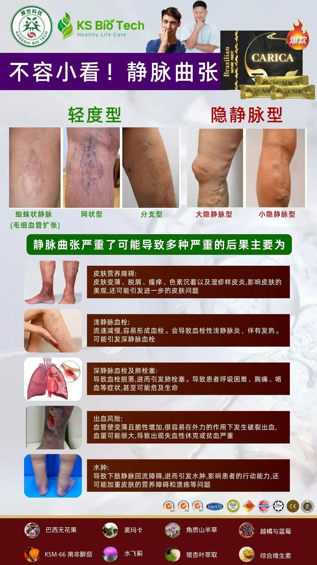 - 出血:曲张静脉破裂可引起无痛性出血(多发生于脚踝附近),需紧急处理。