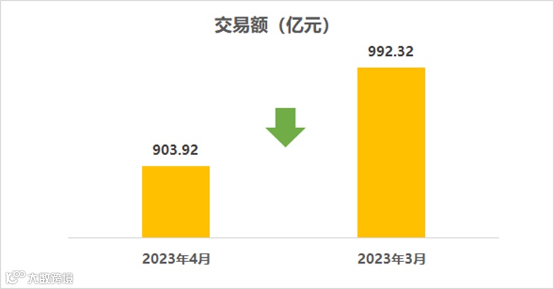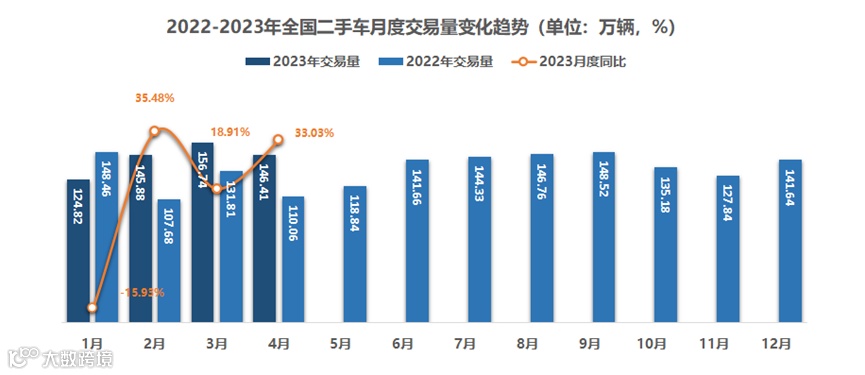 2023年4月,全国二手车市场交易量146.41万辆,交易量环比下降6.59%,同比增长33.03%,交易金额为903.92亿元。