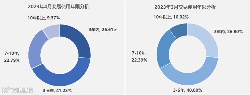 从车龄结构上看4月份车龄变化呈现两头下降的趋势,3年以内、10年以上的车型较3月份有所减少。