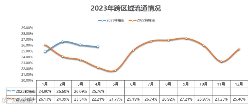 4月跨区域流通持续回落,二手车转籍率为25.76%,环比下降了0.3个百分点,同比去年同期增加了3.6个百分点。二手车转籍总量为37.72万辆,环比下降了7.8%,同比增加了54.3%。从今年前四个月的转籍情况来看,仅1月份低于去年同期水平,从2月份开始均好于去年同期,转籍率基本维持在26%左右。从5月前两周的情况来看,市场压力依然较大,五一小长假对于二手车消费的带动并不明显,预计五月份转籍情况不会出现明显的变化。