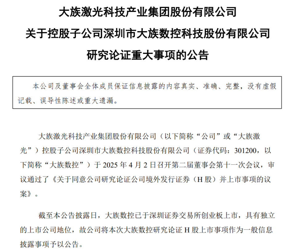 大族激光发布公告,控股子公司大族数控于2025年4月2日召开董事会,审议通过了关于研究论证境外发行证券(H股)并上市事项的议案。